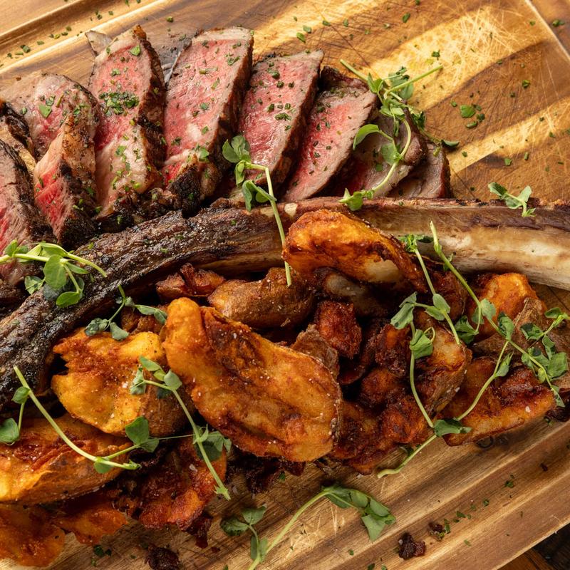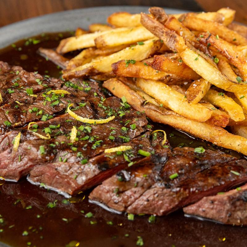Because we cook with what’s in season—and what’s inspiring us—our menu changes often. One week you might find dry-aged Wagyu with truffle risotto. The next, wood-fired pork, rainbow trout with citrus glaze, or our famed duck fat fries beside a perfectly crafted burger.